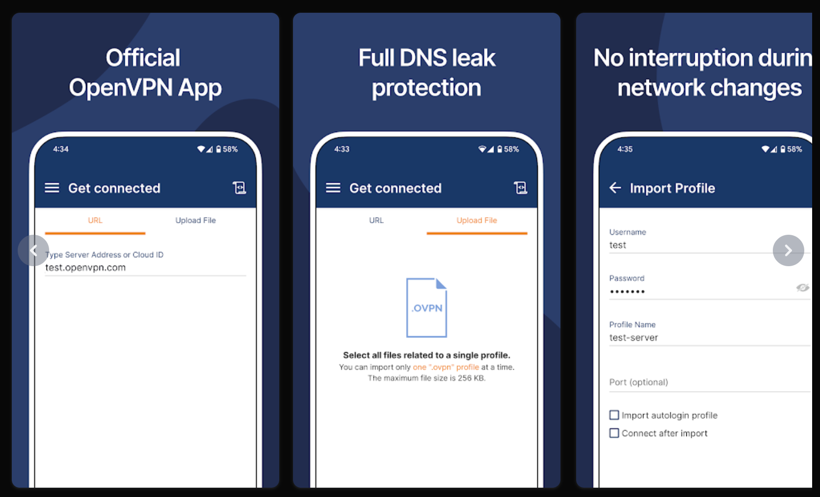 - Easy profile import – Simple .ovpn file import and URL-based setup